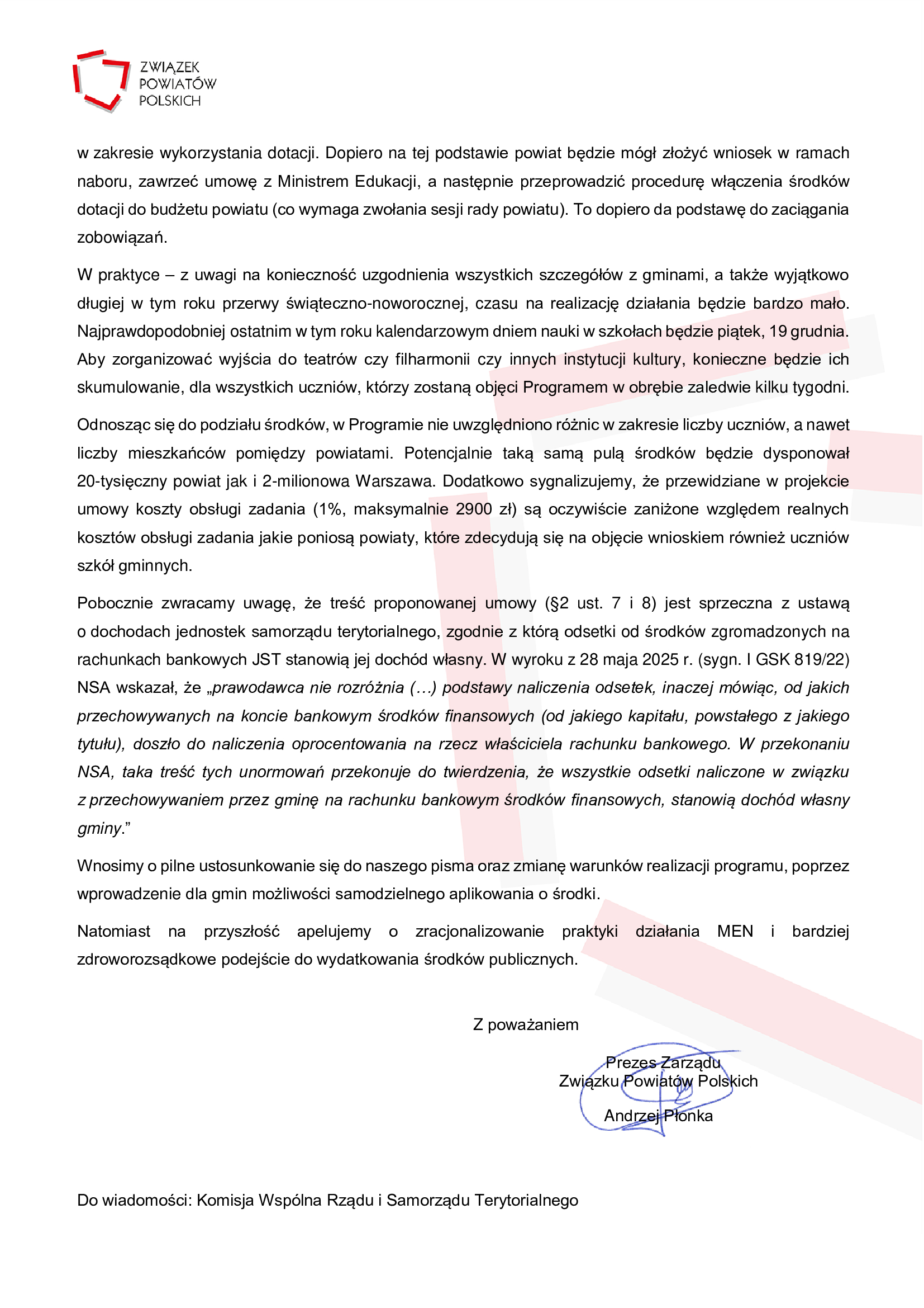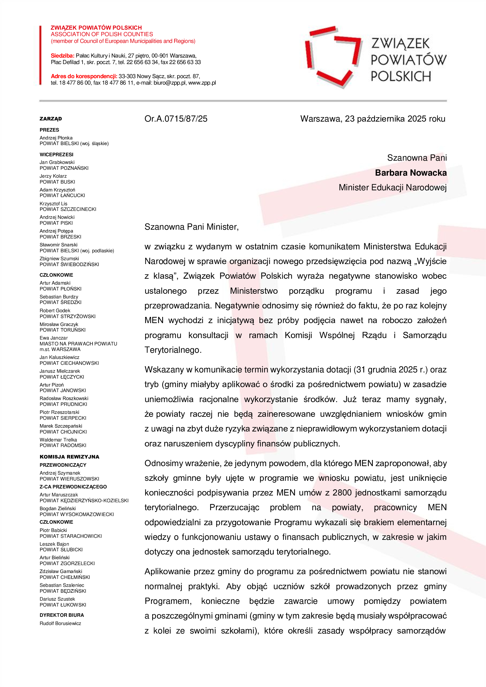 Stanowisko Związku Powiatów Polskich wobec ustalonego przez Ministerstwo Edukacji Narodowej porządku i zasad nowego przedsięwzięcia pn. "Wyjście z klasą".